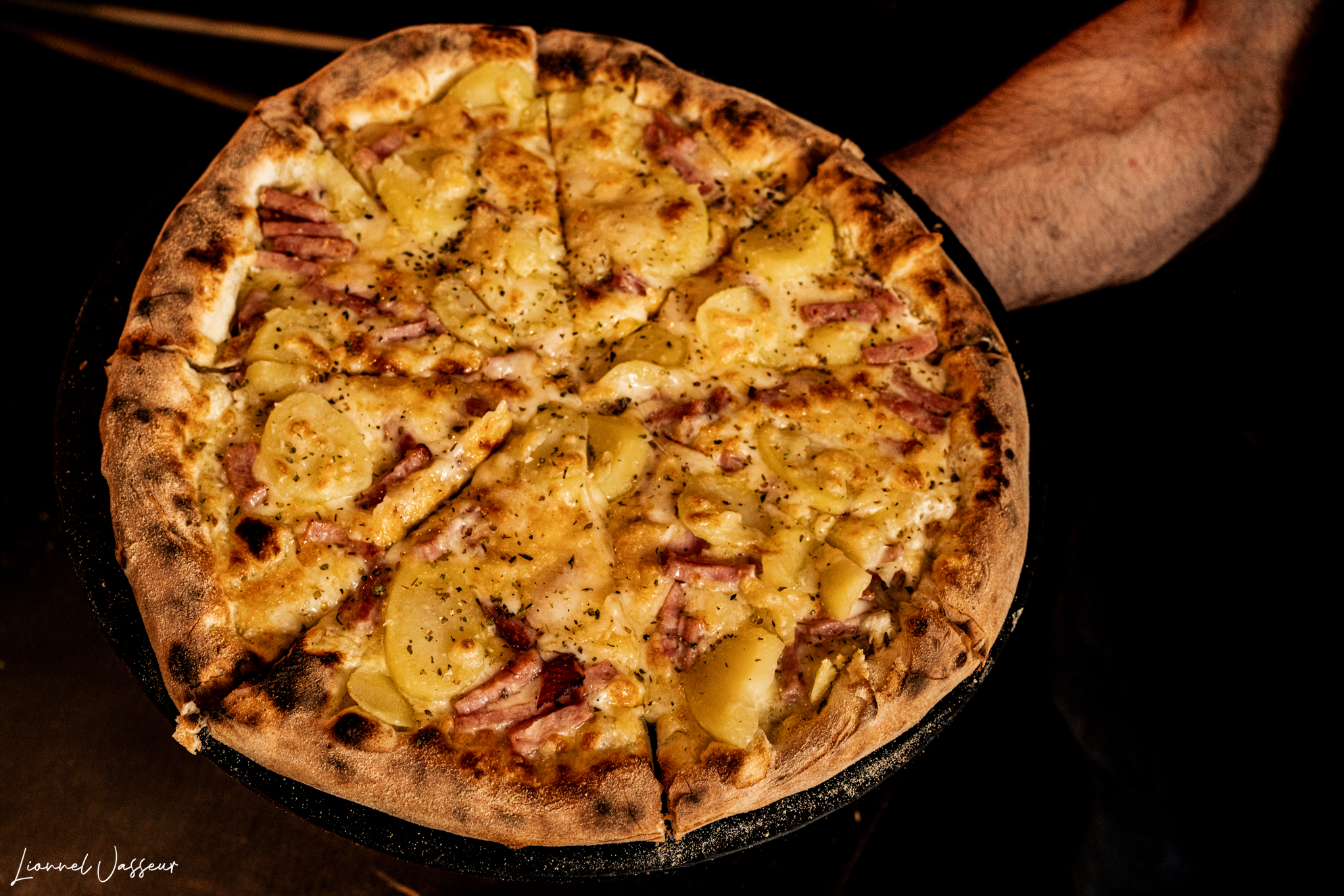 Crème fraîche, mozza, lardons grillés, pommes de terre, fondue aux trois fromages (comté, emmental et beaufort).