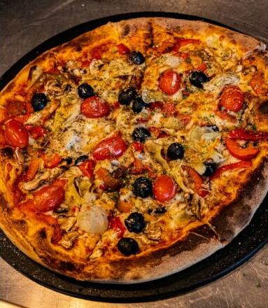 Sauce tomate, mozza, olives noires, basilic frais, artichauts marinés, tomates cerises, poivrons et champignons