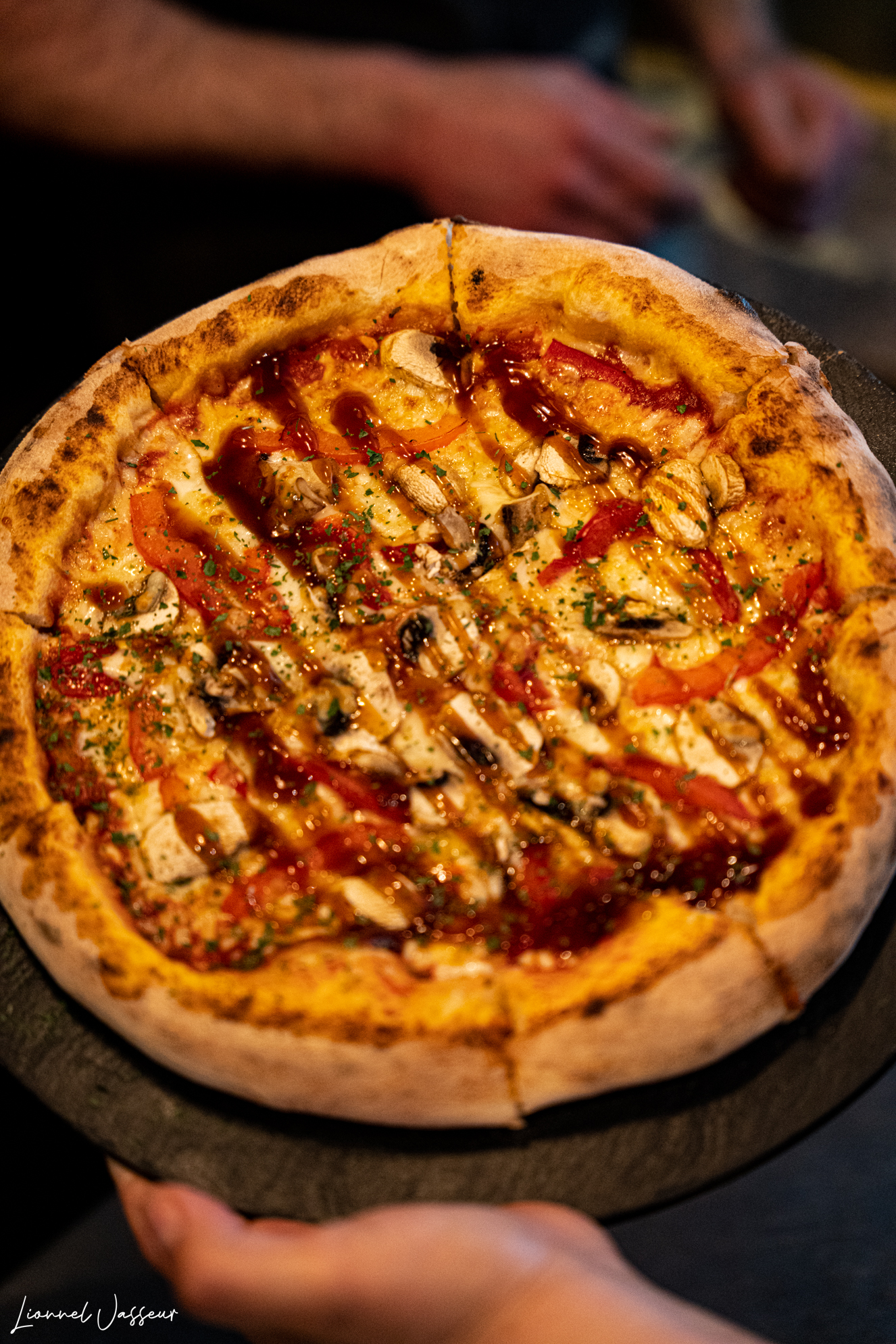 Sauce tomate, Mozza, Viande hachée charolaise, Champignons, poivrons et Sauce barbecue.