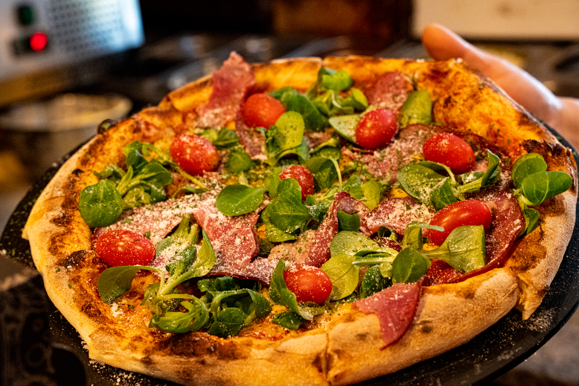 Sauce tomate, mozza, bœuf fumé, parmesan, tomates cerise basilic frais.