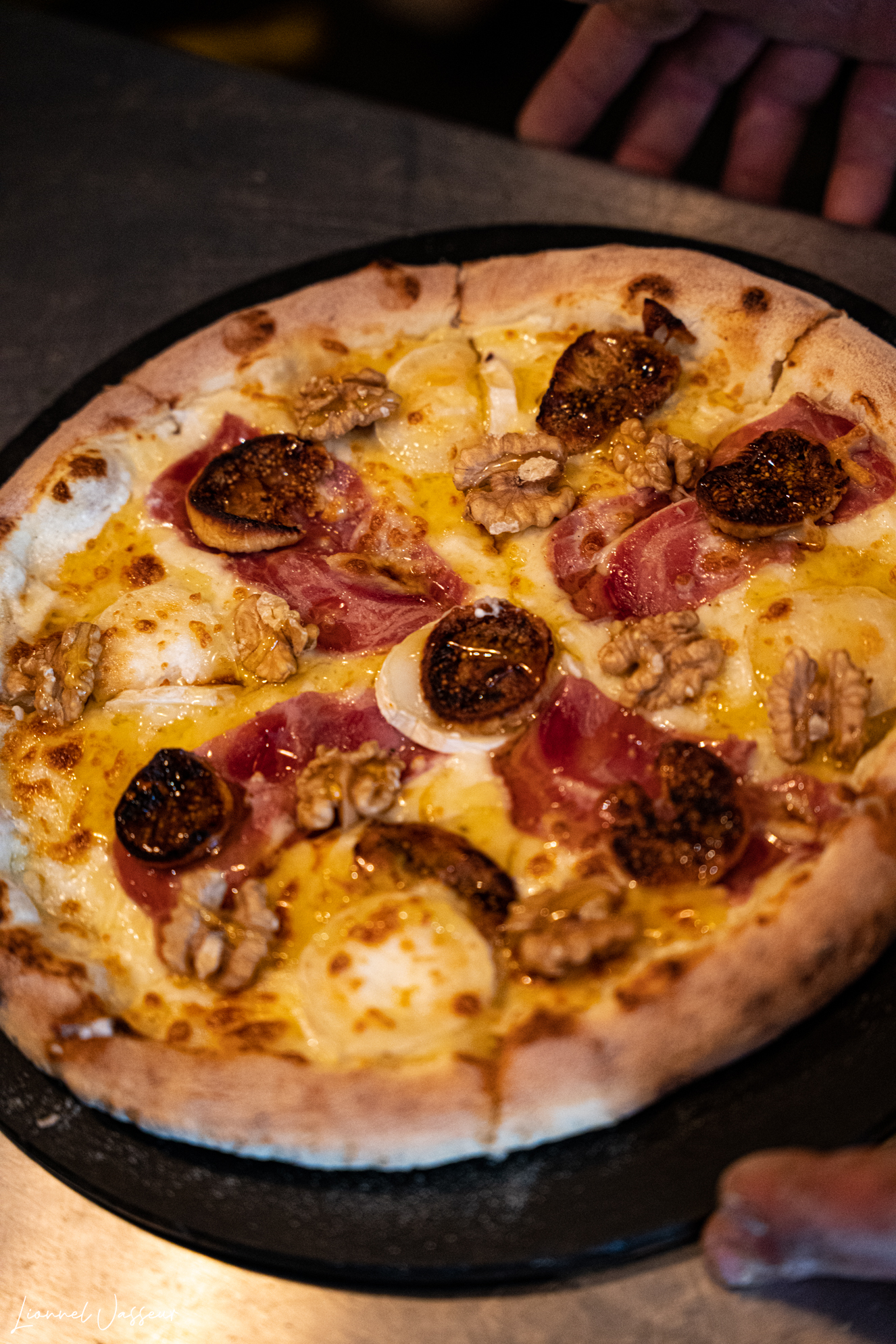 Crème fraîche, mozza, Jambon, fromage de chèvre, miel, figues séchés et noix