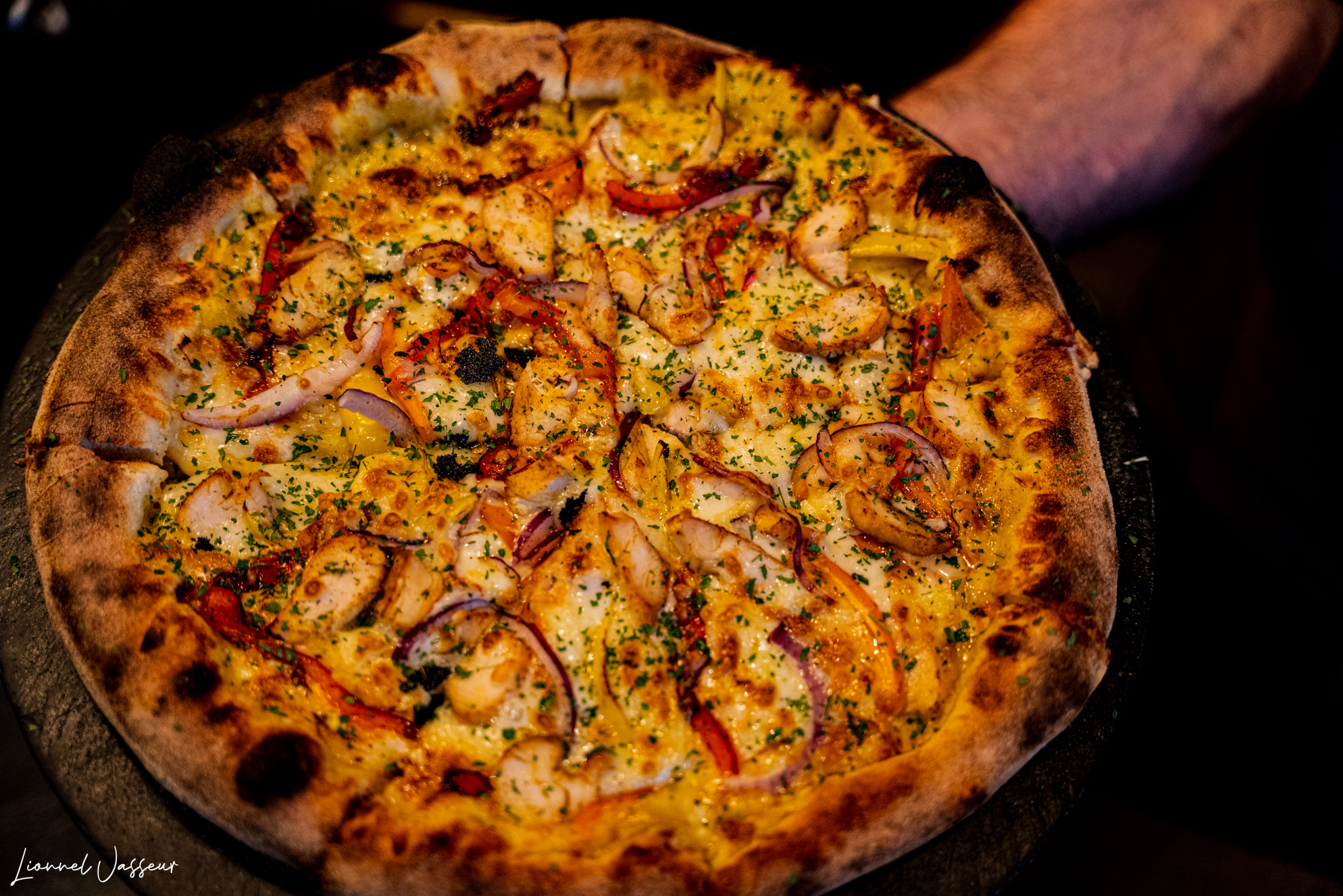 Crème fraîche, mozza, poulet mariné cuit au feu de bois, pommes de terre et champignons frais.