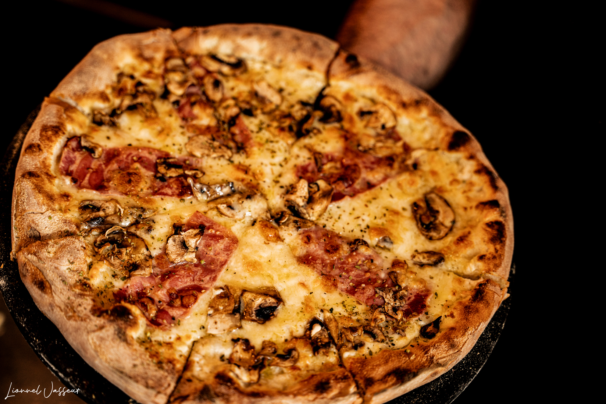 Crème fraîche, mozza, Jambon, champignons frais, parmesan.