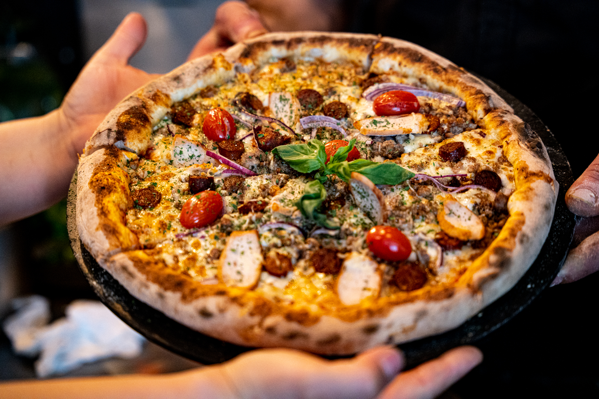 Sauce tomate, mozza, viande hachée charolaise, poulet mariné, merguez du boucher, tomates cerise et oignons rouges.
