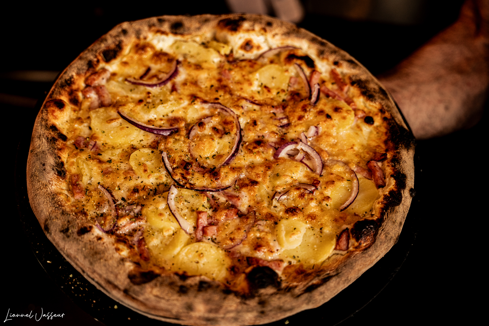 Crème fraîche, mozza, pommes de terre, lardons, oignons et raclette.